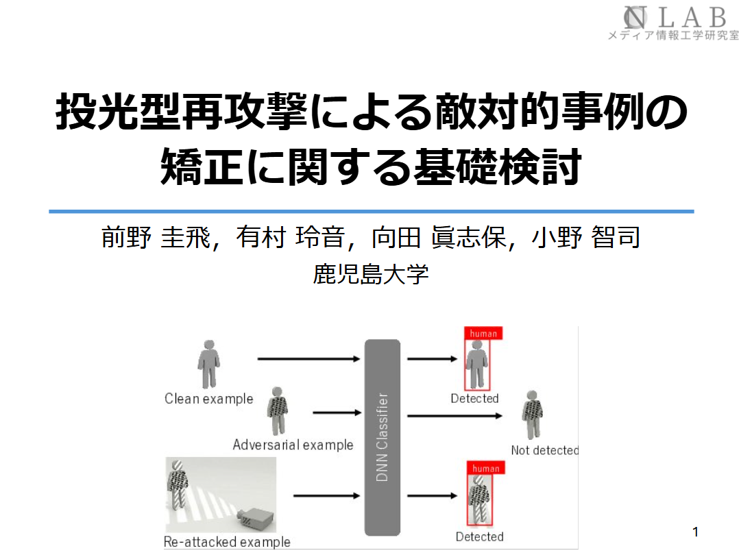 - 前野圭飛,有村玲音,向田眞志保,小野 智司,"投光型再攻撃による敵対的事例の矯正に関する基礎検討",情報処理学会 第88回全国大会