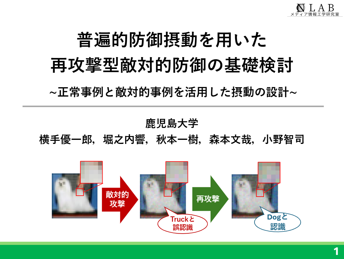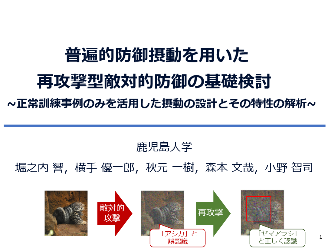 - 横手優一郎,堀之内響,秋本一樹,森本文哉,小野 智司,"普遍的防御摂動を用いた再攻撃型敵対的防御の基礎検討 - 正常事例と敵対的事例を活用した摂動の設計 -",情報処理学会 第88回全国大会