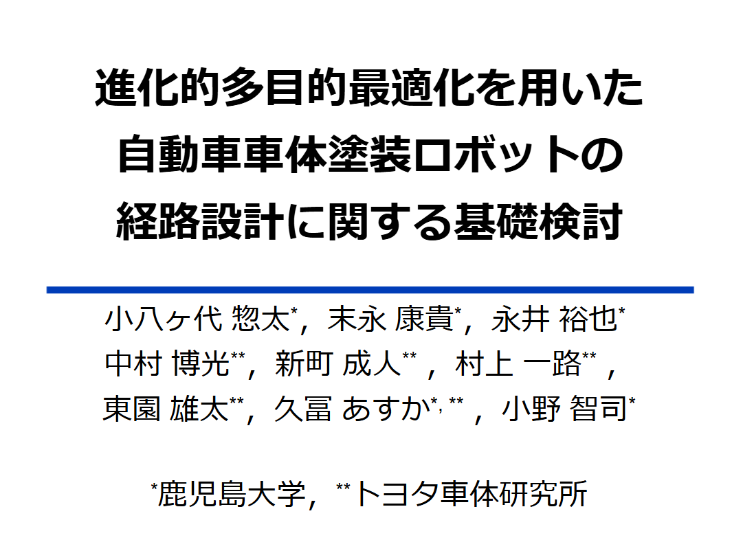 - 小八ケ代惣太,末永康貴,永井裕也,中村博光,新町成人,村上一路,東園雄太,久富あすか,小野 智司,"進化型多目的最適化を用いた自動車車体塗装ロボットの経路設計に関する基礎検討",情報処理学会 第88回全国大会