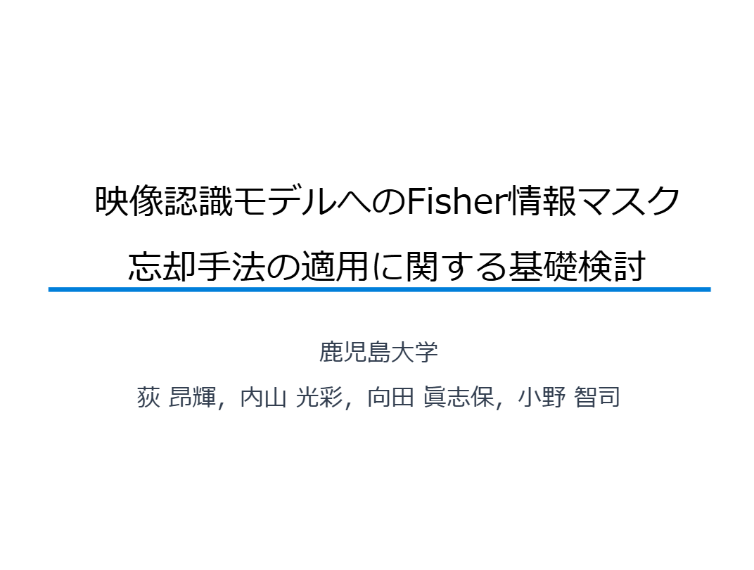 - 荻 昂輝,内山光彩,向田眞志保,小野 智司,"映像認識モデルへのFisher情報マスク忘却手法の適用に関する基礎検討",情報処理学会 第88回全国大会