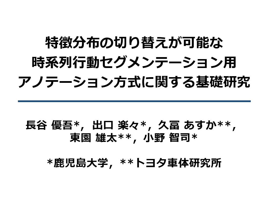 - 長谷優吾,出口楽々,久冨あすか,東園雄太,小野 智司,"特徴分布の切り替えが可能な時系列行動セグメンテーション用アノテーション方式に関する基礎研究",情報処理学会 第88回全国大会