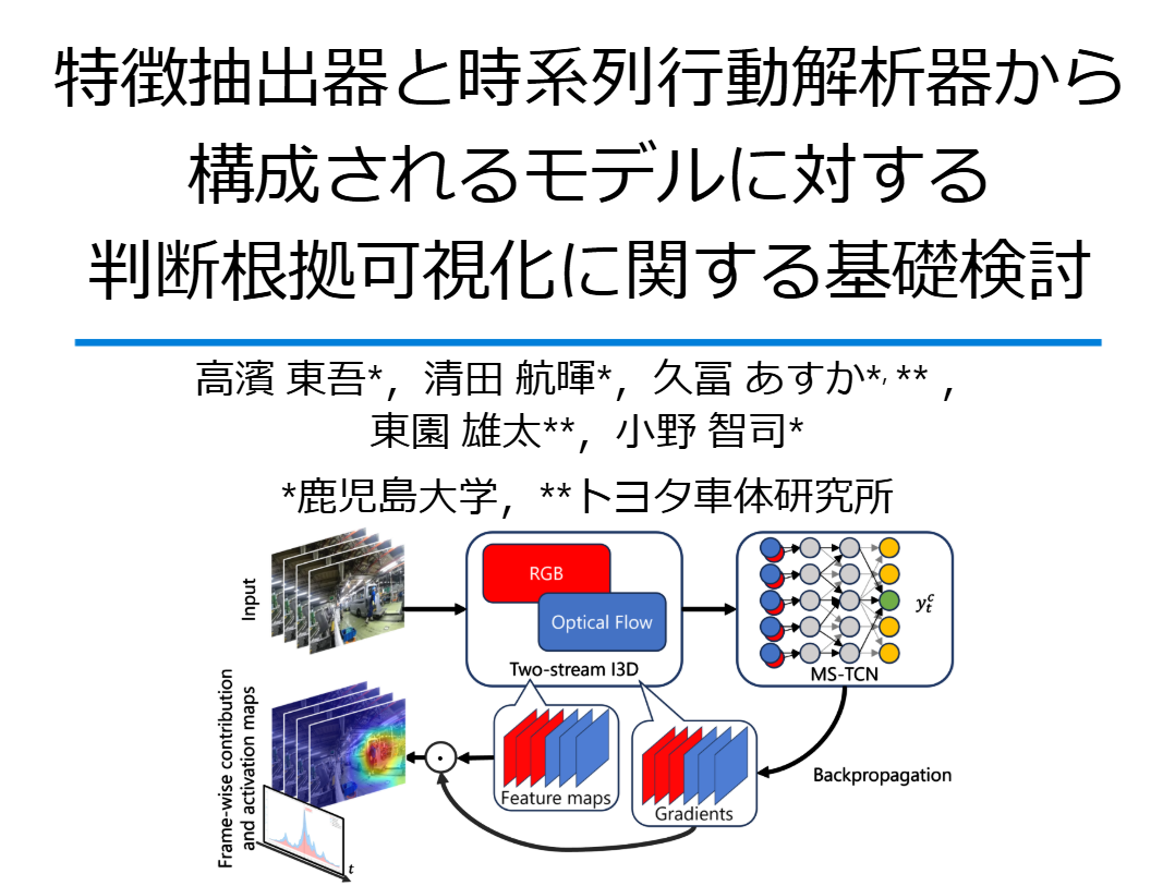 - 高濱東吾,清田航暉,久冨あすか,東園雄太,小野 智司,"特徴抽出器と時系列行動解析器から構成されるモデルに対する判断根拠可視化に関する基礎検討",情報処理学会 第88回全国大会