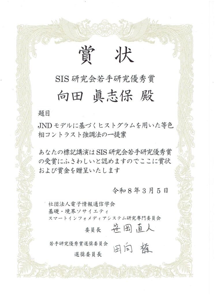 本研究室の向田眞志保が2025年電子情報通信学会スマートインフォメディアシステム研究会(SIS研究会)において若手研究優秀賞を受賞しました.同賞は前年度3月,当該年度6月,9月,12月に開催された研究会のうち優秀な発表を行った2名に授与されました.